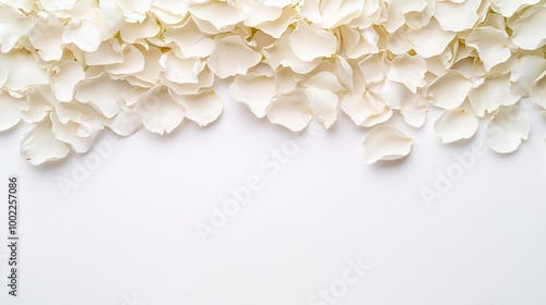 A white background adorned with numerous white flowers at the base of an image, and the base of the flower arrangement at the base of the image