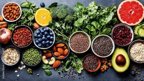 Fruits, veggies, nuts, spread across bowls in dark setting