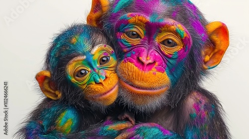 Two monkeys sitting adjacent on a white background with painted faces