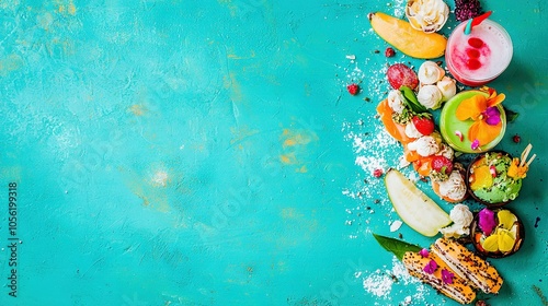 Various cuisines displayed on a blue background with sprinkles and powdered sugar sprinkled on top