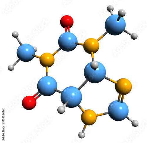 3D image of Theophylline skeletal formula - molecular chemical structure of dimethylxanthine isolated on white background