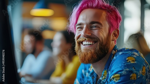 A cheerful man with vibrant pink hair and a beard, smiling joyfully in a casual, creative setting, symbolizing self-expression and individuality.