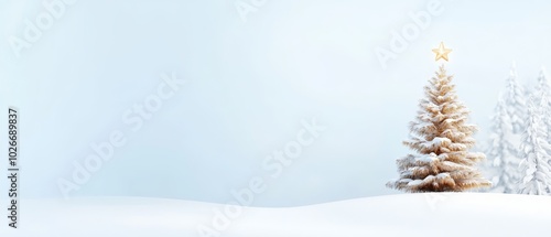 A Christmas tree, crowned with a star, stands centrally in a snow-covered field Trees dot the background