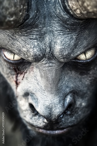 A close up of a goat's face with yellow eyes
