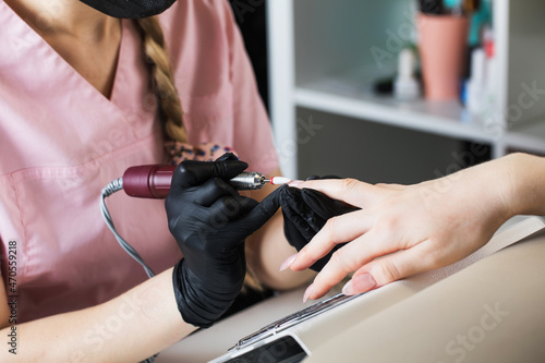 A manicurist removes gel polish from nails using a milling cutter. Hardware manicure close-up. Coating shellac on nails