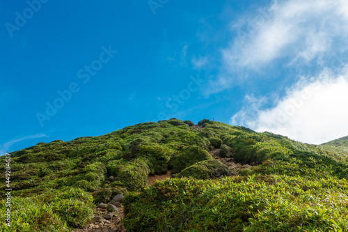 大分県玖珠郡九重町、竹田市久住町のくじゅう連山を登山している風景 A scene of climbing the Kujyu mountain range in Kusu-gun, Kokonoe-machi and Takeda-shi, Oita Prefecture.