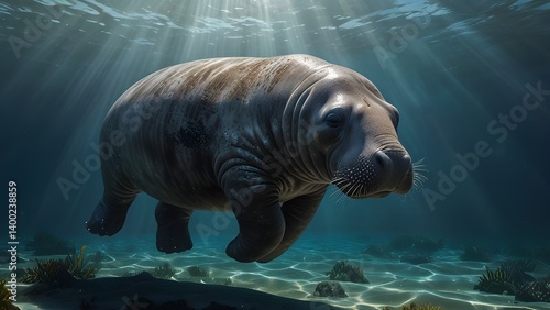 A serene and majestic sea cow, also known as a manatee, is depicted in a calm and peaceful ocean environment, with sunlight filtering down through the gentle waves, illuminating its sleek grey and br