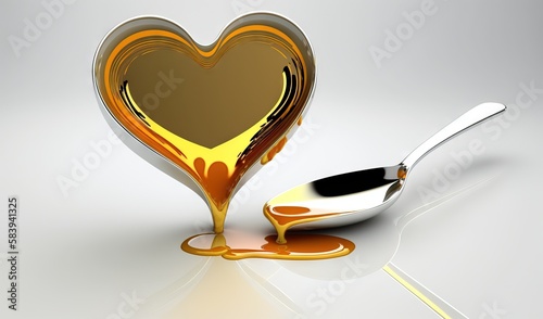 a spoon with a liquid pouring out of it next to a heart shaped container with a spoon in it and a spoon in front of it. generative ai