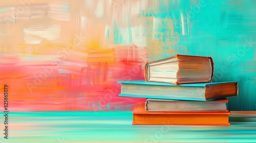A stack of books before a blue-orange wall Behind them, a city painting in the background