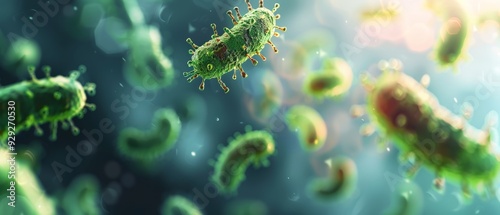 A tight shot of a cluster of green microorganisms against a backdrop of blue and green Background features a softly blurred light source