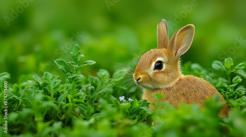A tight shot of a small rabbit among verdant grass and shrubs, surrounded by a softly blurred backdrop