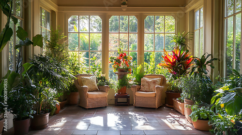 A Victorian sunroom bathed in filtered light, leafy plants and fragrant flowers adding charisma