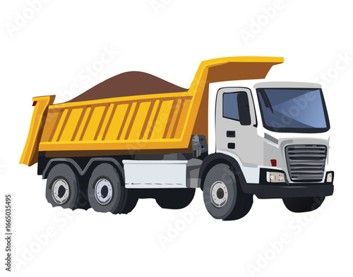 A white and yellow dump truck with a raised bed, a clean and professional image for industrial purposes