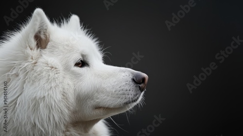 A white dog's face, gazing off-kilter against a solid black backdrop ..Or, for a more concise version:..