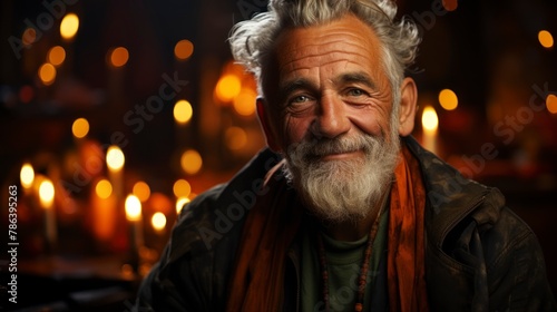 A white-bearded man wearing a black jacket is standing in the foreground of the scene. He appears focused and determined, exuding a sense of authority and experience.