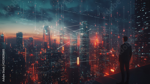 Abstract business man stands on Smart digital Innovation city with connection network reciprocity over the twilight cityscape. of future wireless digital city and social media networking systems