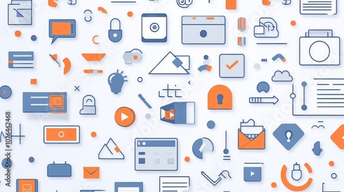 Abstract seamless pattern with colorful buttons and icons on a white background, in a flat lay
