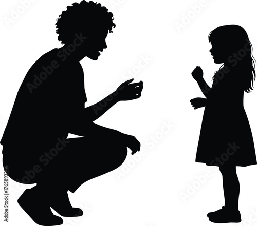 Adult teaching child silhouette, parent guiding daughter, family interaction, emotional moment, black and white vector illustration, communication, learning, parenting, gesture concept