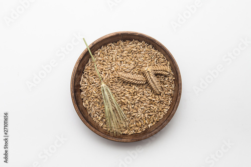 Barley grains with wheat ear on plate isolated