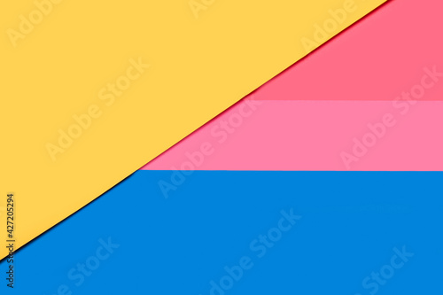 Fondo geométrico de papel amarillo, rosa y azul. Vista superior. Copy space