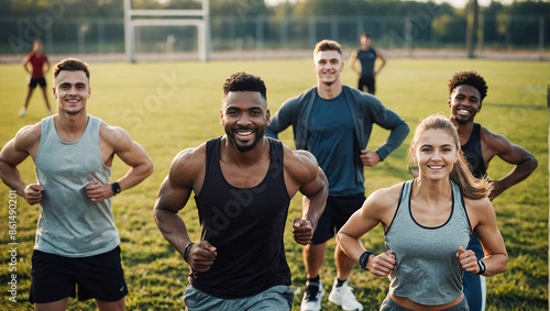 Friends running together on a field, radiating joy and enthusiasm for fitness.