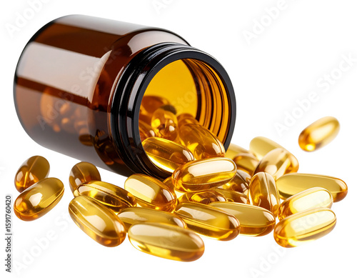 Golden health supplement capsules spilling from amber bottle isolated on transparent background PNG