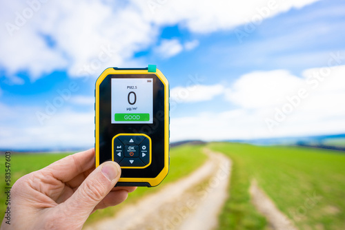 hand holding an air quality detector against the backdrop of a beautiful summer landscape. The device is being used to measure the air quality in the environment,
