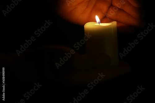 ** Illuminated Hand Holding Candle in Dark Room for Tranquility and Reflection Meditation