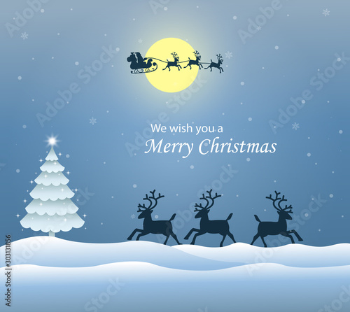 Illustration of a white Christmas tree in winter. Santa Claus flies on Christmas Eve. View of yellow moon and Reindeer. Merry Christmas greeting card.