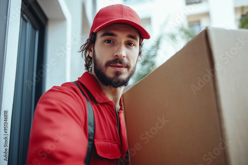 man in a red shirt is smiling and holding a cardboard box. He looks happy and content