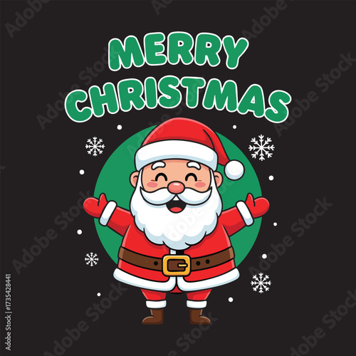Merry Christmas Text with Cartoon Santa Claus on Green Circle - Festive Vector Illustration for Greeting Cards and Social Media