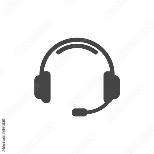 Minimalist flat vector illustration of a customer service headset with microphone, solid dark gray color, no gradients, sharp edges, isolated on pure white background.