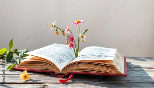 Open book with flowers, blurred bokeh background, distinct split composition, sharp focus on the book and flowers, soft background