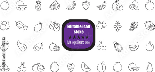outline icons related to fruits, vegetables and berries. Linear icon collection. Editable stroke.