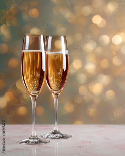 Pair of champagne flutes with golden bubbles on marble table against festive bokeh lights
