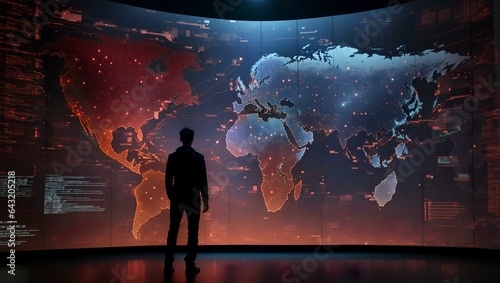 person standing in front of a giant digital screen with a flow of data showing various cyber threats and vulnerabilities