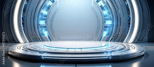 Podium background 3D light tech stage future platform game abstract. Podium 3D background technology room product circle glow effect portal stand studio scene white design ring modern display space.