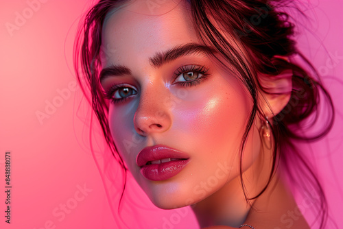 Portrait of a beautiful woman on neon pink background. Cover magazine, wallpaper and poster design.