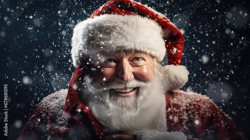 . Portrait of a happy Santa Claus making magic at night, releasing magical Christmas stars. watercolor drawing