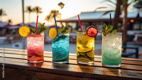 set of Alcoholic cocktails, Variety of alcoholic drinks and multi colored cocktails on the reflective surface of bar counter, Cocktails served at an outdoor bar.