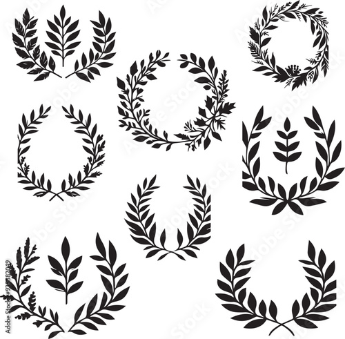 Set of wreaths and branches with leaves-Leaf Wreath Images-Olive Branch Wreath vector -Branches And Leaves Wreath royalty -Set wreaths and laurel.Hand painted black and white silhouette