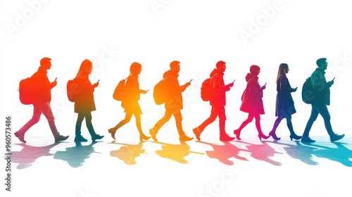 Silhouettes of people walking, depicted in gradient colors, symbolizing diversity, movement, and modern digital culture.