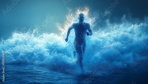 The human body shape of a running man filled with blue water on a blue gradient background - sport or fitness hydration, healthy lifestyle or wellness concept design