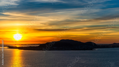 top view of a sunset over The city of Alesund and the sea during a sunny evening, Norway