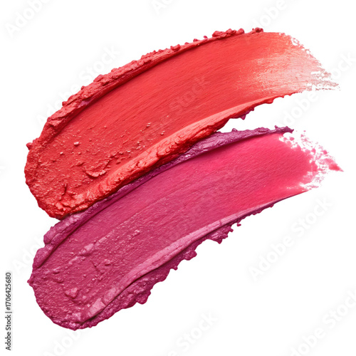 Two vibrant lipstick swatches with creamy texture isolated on a dark background