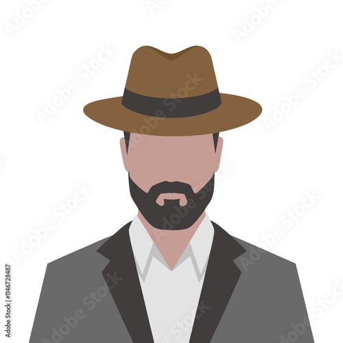 Vector Illustration Man Wearing Brown Fedora Hat Gray Suit and Beard Close-Up