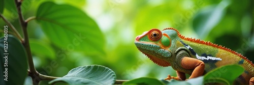 Vibrant chameleon resting on green leaves in a tropical setting