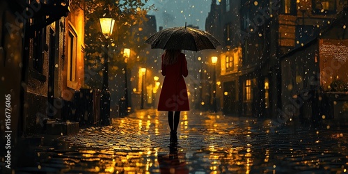 Woman holding umbrella in rain, standing on cobblestone street at dusk, framed by warm streetlights and reflecting puddles, evoking romantic and moody urban charm.