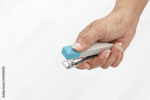 woman's hand stapling paper on white background