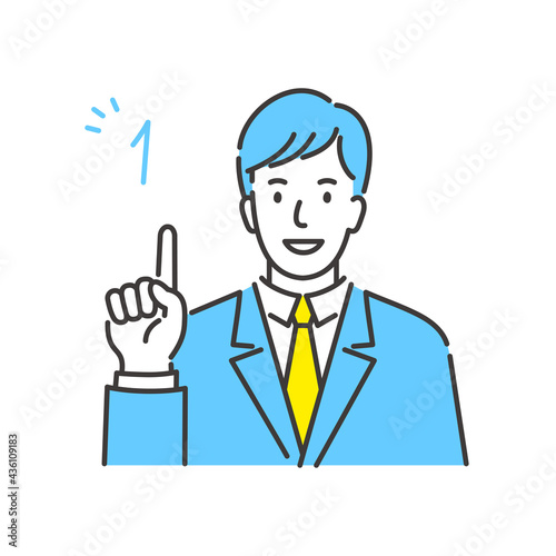 笑顔で指を1本立てたスーツ姿の若いビジネスマンのベクターイラスト